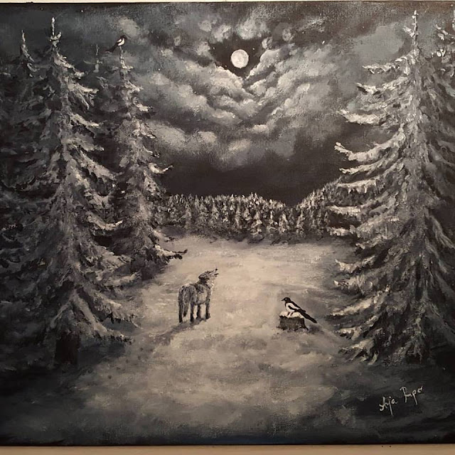 Samoihin aikoihin maalasin tätä taulua ja halusin siihen jostain syystä suden, yllätys olikin kun törmäsin netissä, että tammikuun täysikuu on suden kuu....